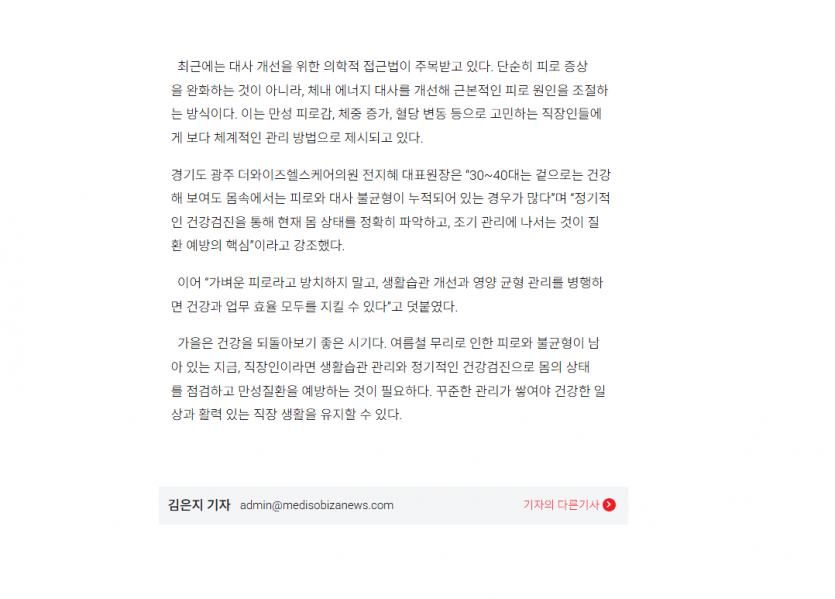 - 다음글더와이즈헬스케어의원 전지혜 대표원장님 가을철 건강검진 관련 인터뷰! 25.09.24
